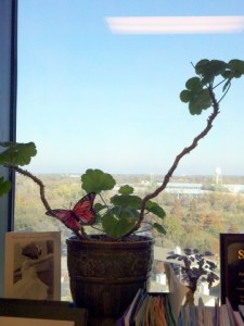he geranium is funky; at one point, one stalk grew halfway up my window in a straight shoot! I tried pruning it and rooting it to share with a friend (and to keep the pot from toppling over). It rooted well but didn’t take when they repotted it at home. I love the butterfly picks; they make me happy. I think I will try repotting this one into a bigger container, also; it seems a little crowded.