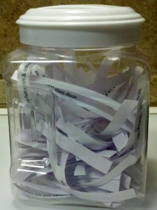 A fellow mom of many created a bucket for wayward items that she “ransomed” from the kids. In order to retrieve a confiscated item, the kids have to draw a chore/assignment from the to-do list. I have put toys, etc., in “time out” before, but I love the idea of having to earn them back. Clever!