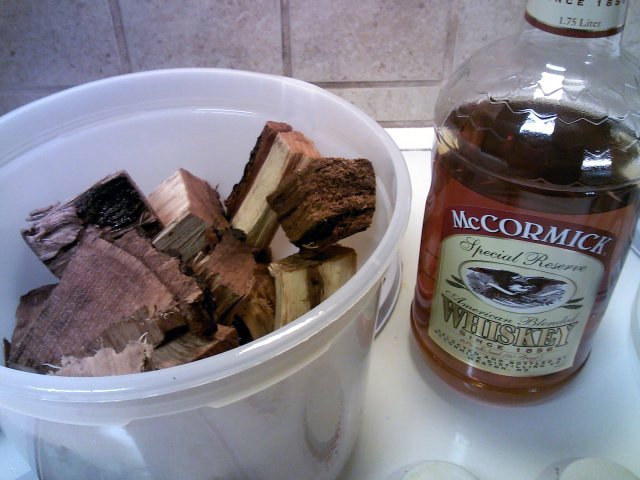 I started the charcoal and put some hickory chips in a tub with a very inexpensive bourbon (not wasting the pricey stuff on wood chips!) to soak while I tended to the birds.