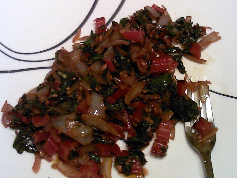 I was buying some fresh spinach the other day and noticed that Swiss [red] chard was on sale, so I decided to try it. Like other leafy greens, chard is chock-full of good stuff like Vitamins A, C & K, not to mention fiber and even some protein.The stalks are a brilliant red that reminds me of rhubarb, and the leaves are deep green.